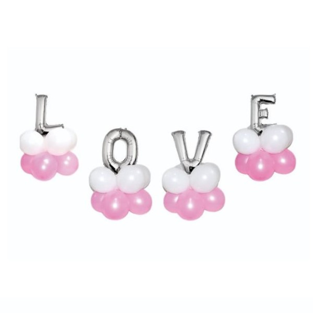 Kit-ul cuprinde baloane folie litere argintiu de 35 cm LOVE si 32 baloane latex alb si roz pe care le veti folosi pentru a alcatui acest kit.Veti avea nevoie de o pompa manuala pentru a putea umfla baloanele de o anumita masura si fie simetrice.Noi de obicei umflam baloanele cu 25 pompe cele roz si 20 de pompe cele albe, le prindem intre ele doua cate doua si apoi formam un ansamblu de 4 baloane.Pentru a aranja o parte pune-ti la baza cele roz,cu ajutorul unui balon lung prins intre ele legati ansamblu de 4 baloane albe si la final pune-ti litera.