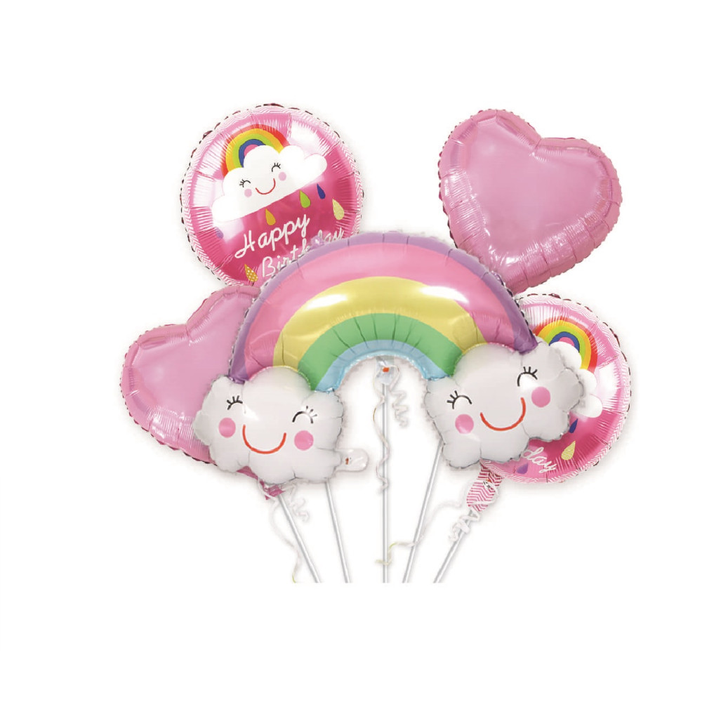 Set 5 baloane din folie de aluminiu, tip curcubeu, inimioare si norisori, 45 cm, roz